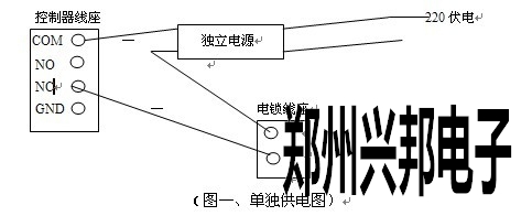 2、 鎖到控制器的連接線需采用2芯電源線,控制器到鎖距離不可以超過100米,線徑大于1.0 mm。如有需門磁檢測線則需多2芯線。(可根據(jù)現(xiàn)場需要定)。如果輸出12V電源有明顯降壓則可以微調(diào)電源電壓到13.6V或單獨給電鎖供電(如圖一)。