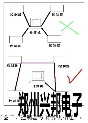 控制器GND 485- 485+分別對應連接485轉(zhuǎn)換器GND TD(A) TD(B),通訊線路采用串聯(lián)掛接式連接,請勿采用星型連接或者局部星型連接(如圖二)。如果線路過長和設備過多,請在最后一臺設備上增加終端電阻(有跳線加載)總線最多可掛接128臺控制器。