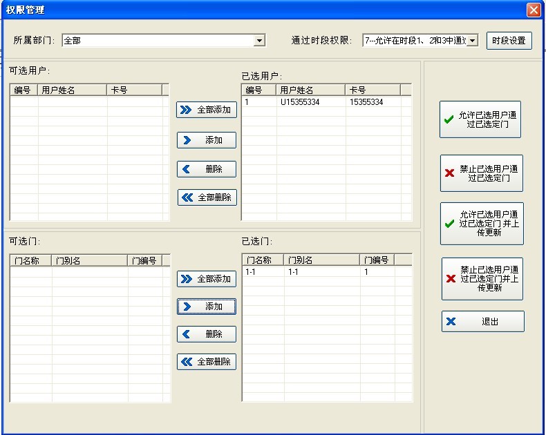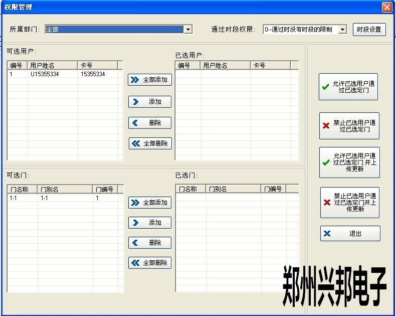 4、上傳完成后關(guān)閉窗口,在‘通過時(shí)間段權(quán)限’中選擇需要的時(shí)間段然后將用戶和控制器都添加進(jìn)去,最后點(diǎn)擊‘允許已選用戶通過已選定門并上傳更新’上傳權(quán)限。如下圖所示