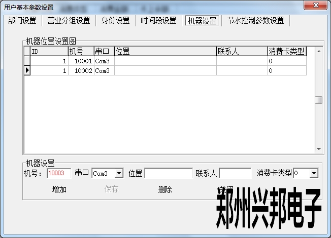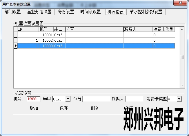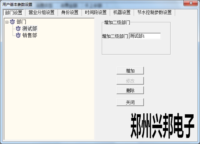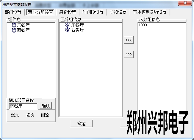 在使用興邦一卡通平臺(tái)用戶基本參數(shù)設(shè)置中有部門(mén)設(shè)置、營(yíng)業(yè)分組設(shè)置、身份設(shè)置、時(shí)間段設(shè)置、機(jī)器設(shè)置、節(jié)水控制參數(shù)設(shè)置。下面依次為其說(shuō)明。