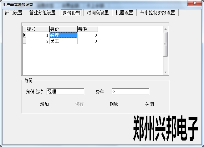 身份設(shè)置是對(duì)持卡人身份的說(shuō)明,通過(guò)讀卡可以看到此人的身份。直接輸入身份名稱,費(fèi)率填寫(xiě)0,暫不起作用,點(diǎn)擊增加,增加成功后,選中信息進(jìn)行雙擊可以對(duì)身份名稱進(jìn)行修改,也可以刪除。