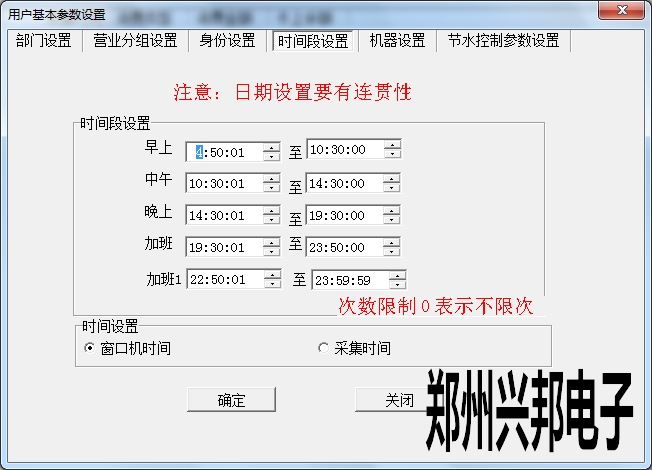 時(shí)間段設(shè)置是為了方便統(tǒng)計(jì)不同時(shí)間段餐別的消費(fèi)情況。在設(shè)置時(shí)設(shè)置每個(gè)時(shí)間段之間不能交叉,不能跨天,時(shí)間由小到大進(jìn)行設(shè)置。另外可以選擇窗口機(jī)時(shí)間和采集時(shí)間進(jìn)行時(shí)間設(shè)置。窗口機(jī)時(shí)間是按照在機(jī)器上刷卡時(shí)形成消費(fèi)記錄的時(shí)間;采集時(shí)間是按照機(jī)器聯(lián)機(jī)進(jìn)行數(shù)據(jù)采集上傳的時(shí)間形成消費(fèi)記錄的時(shí)間。點(diǎn)擊確定即設(shè)置成功。