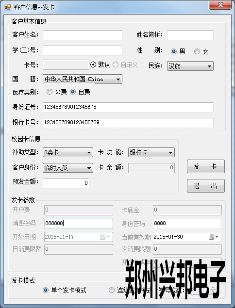 單個發(fā)卡是現(xiàn)將基本信息填寫完成后將卡片放在讀卡器上直接進行發(fā)卡。有單個發(fā)卡模式和連續(xù)發(fā)卡模式兩種發(fā)卡模式。