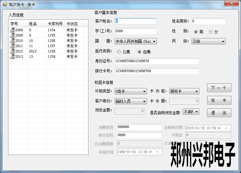 批量發(fā)卡是在有多條未發(fā)卡信息的條件下直接連續(xù)發(fā)卡,未發(fā)卡信息可以在信息設置中手動錄入也可以通過導入信息表,將未發(fā)卡人員信息手動導入。然后點擊批量發(fā)卡。