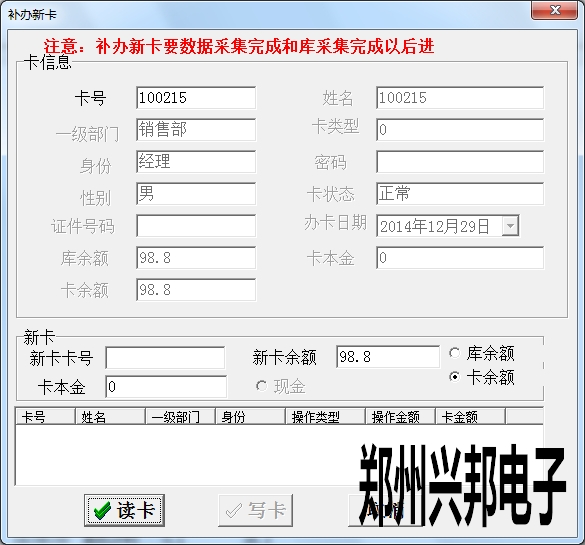 注: 收繳舊卡是卡片不再使用將卡片收回的操作,進行讀卡,卡庫一致的情況下就可進行寫卡,退還卡余額完成操作。收繳回來的卡可以重新發(fā)行。