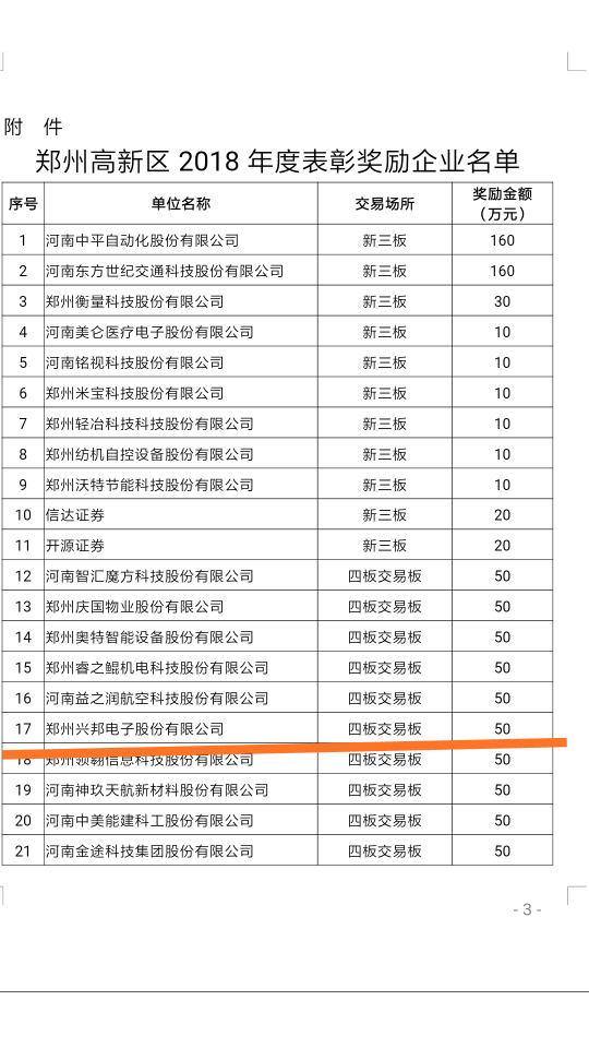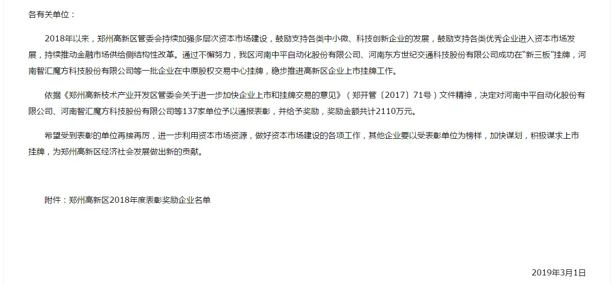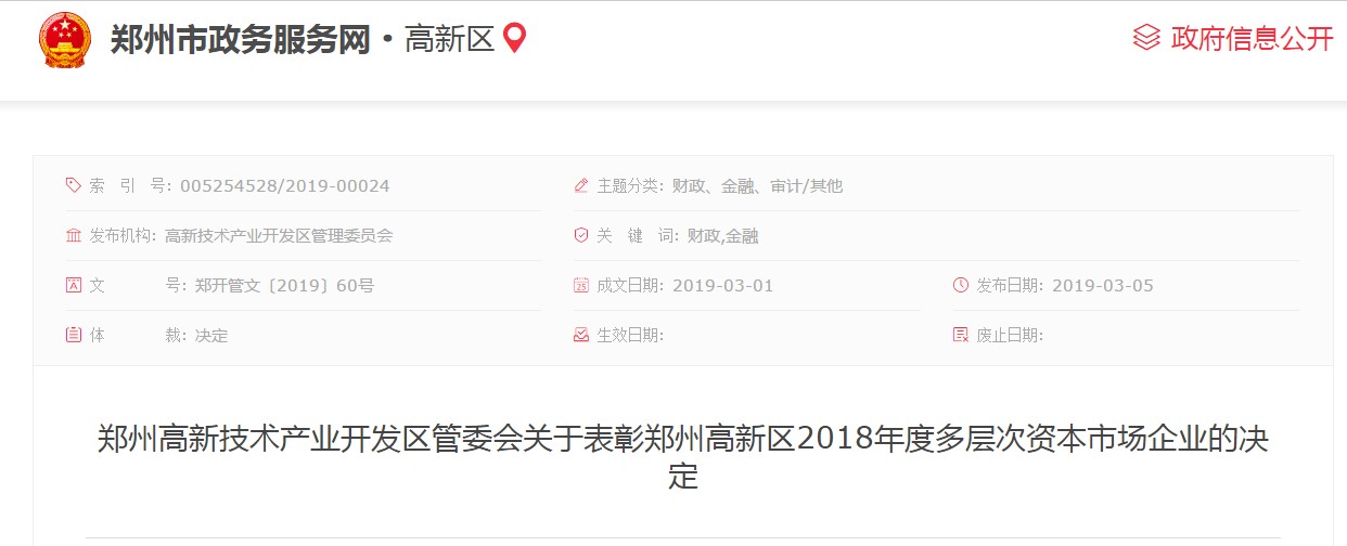 [文章內容簡介]:轉發(fā):鄭州高新技術產業(yè)開發(fā)區(qū)管委會關于表彰鄭州高新區(qū)2018年度多層次資本市場企業(yè)的決定