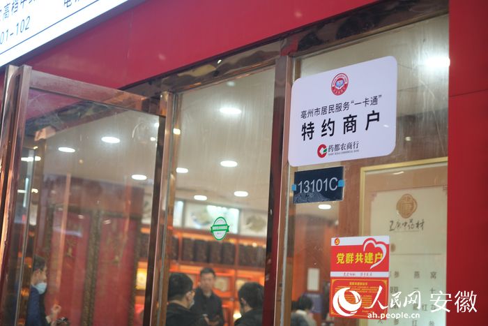 作為全國最大的中藥材集散地,亳州擁有“千家藥企、十萬藥商、百萬藥農(nóng)、千億級市場”,走進(jìn)亳州中藥材專業(yè)市場,人民網(wǎng)安徽頻道發(fā)現(xiàn),不少店鋪門口都掛著“亳州市居民服務(wù)‘一卡通’特約商戶”的牌子。