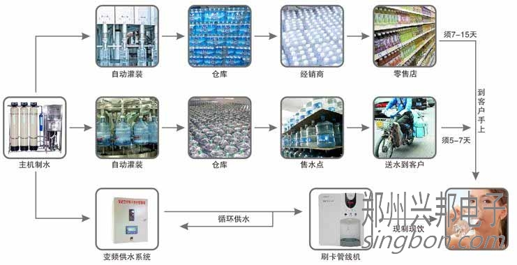 直飲水與桶裝水、瓶裝水生產(chǎn)工藝流程對比圖