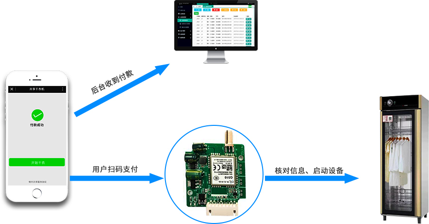 共享干衣機(jī)采用無(wú)人經(jīng)營(yíng)模式,用戶使用掃碼支付使用,運(yùn)營(yíng)商則借助云管理平臺(tái)實(shí)現(xiàn)遠(yuǎn)程管理。